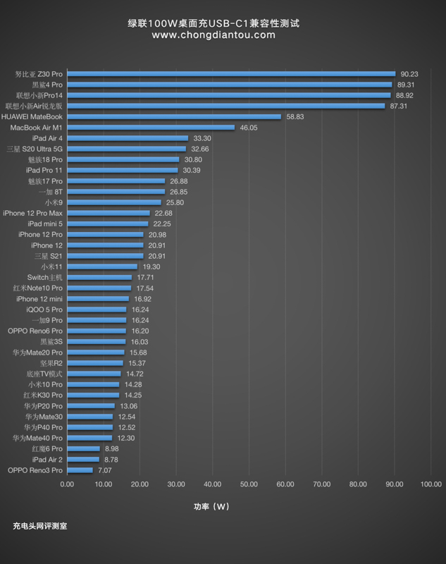 整體來看黑鯊4 Pro和努比亞Z30 Pro的功率較高,排在前面,其他大部分設備的功率均處于正常快充狀態。