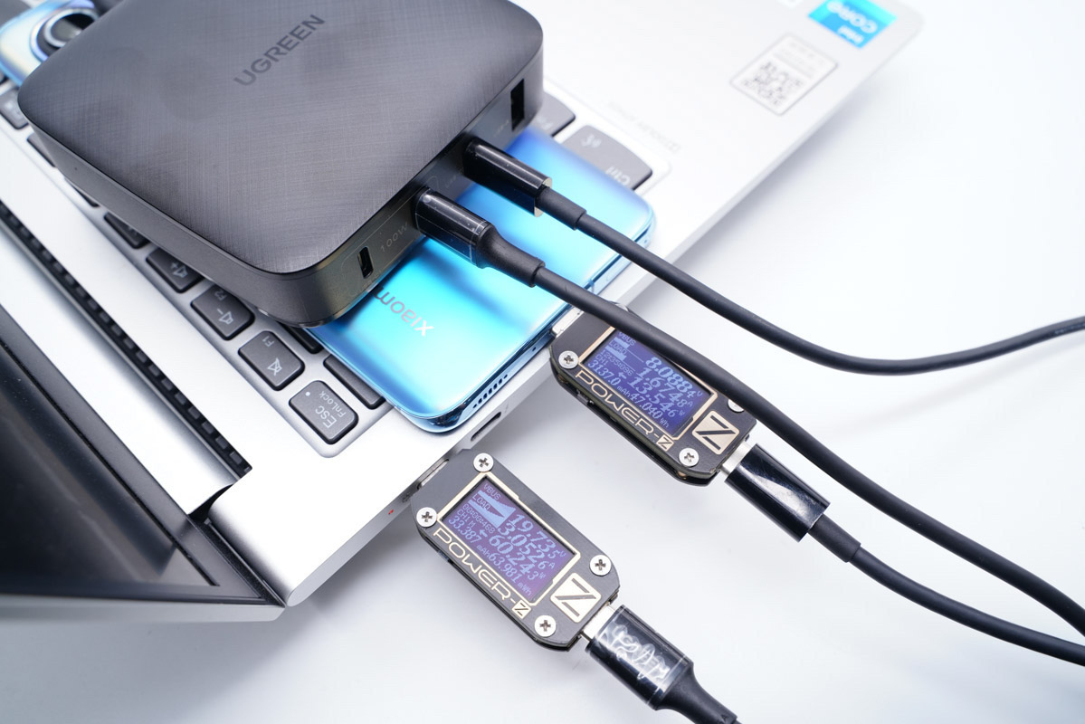 使用C1為筆記本充電,C2為筆記本充電、A口為手機充電,C1功率為39.52W、C2功率為26.51W、C3功率為16.51W。