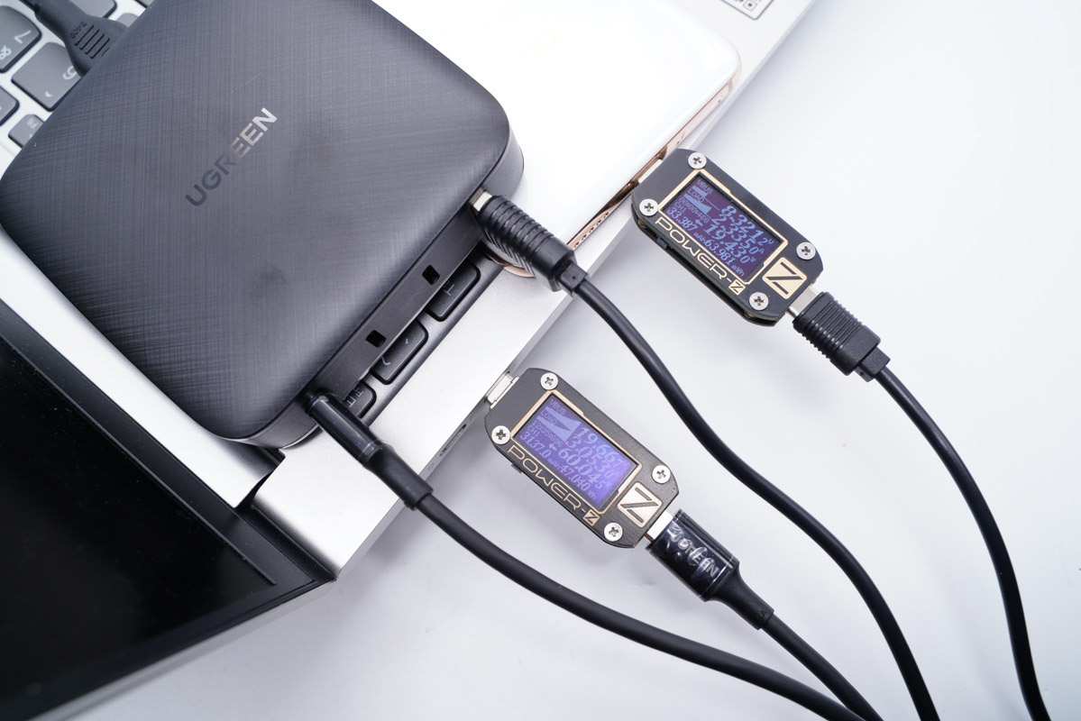 使用USB-C1為筆記本充電,功率為60.04W;同時使用USB-A為手機充電,功率為19.43W。充電器支持C1和A口同時輸出且均處于快充狀態。