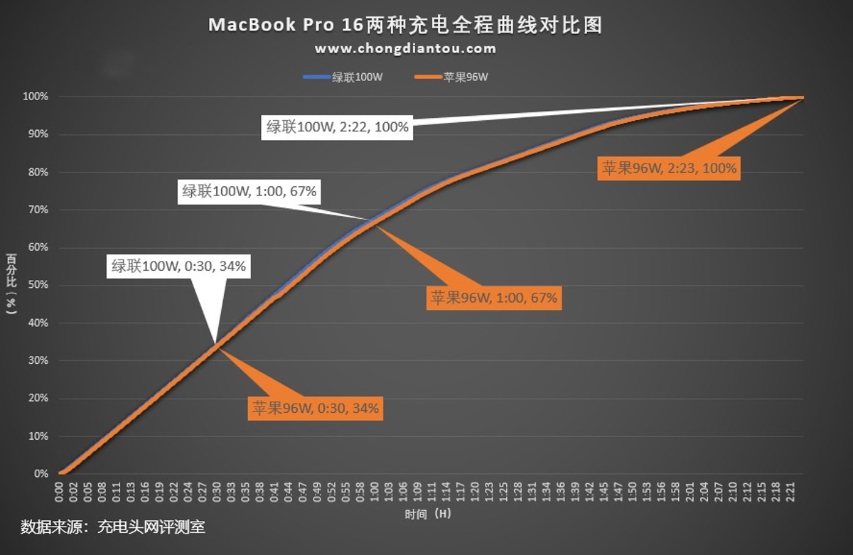 這是UGREEN綠聯100W四口桌面快充充電器與蘋果96W充電器為MacBook Pro 16充電全程的曲線對比,蘋果96W PD充電器是MacBook Pro 16的原裝充電器。可以看出兩條曲線幾乎重合,固定時間內為MacBook Pro 16充入的電量也相同。使用UGREEN綠聯100W四口桌面快充充電器為MacBook Pro 16充電可以獲得和原裝相同的快充體驗。