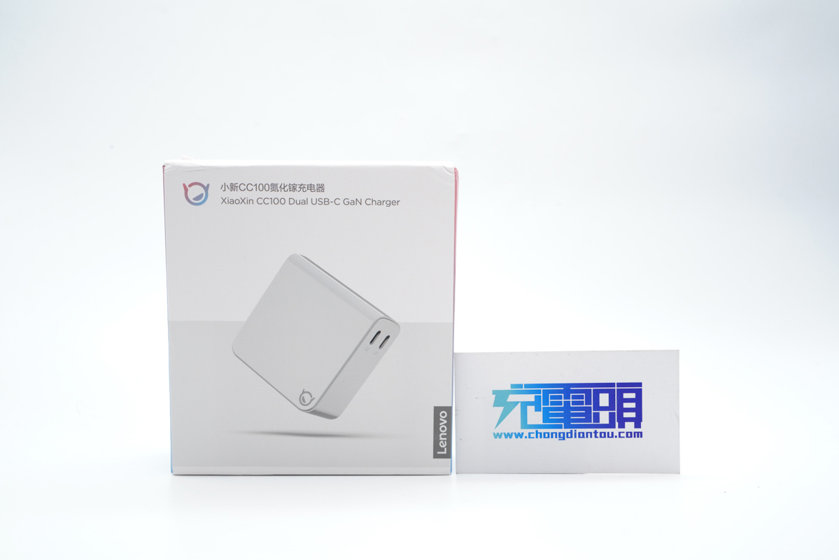 從包裝盒的正面就可以直接看出充電器的三維外觀圖,左上角是這款產品的名稱:聯想小新CC 100氮化鎵充電器。