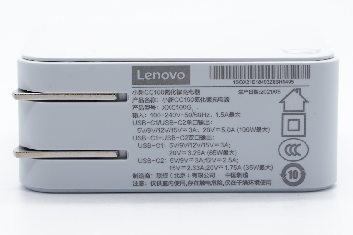 在單獨使用時聯想CC 100氮化鎵充電器的兩個USB-C接口均支持100W輸出功率,在雙口同時輸出時會調整為65W+35W,可以同時滿足兩臺筆記本電腦的充電需求。