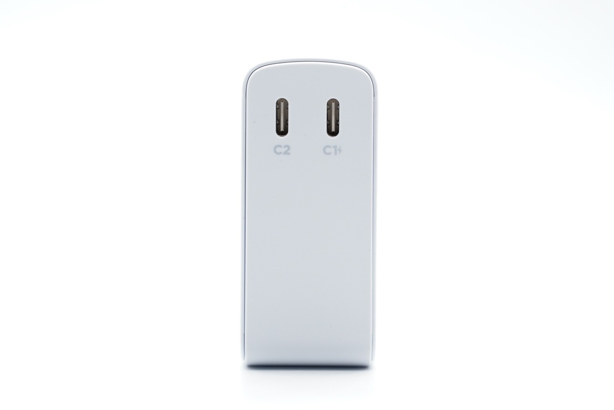聯想小新CC 100氮化鎵充電器采用雙USB-C輸出接口,接口下方標注名稱方便識別。