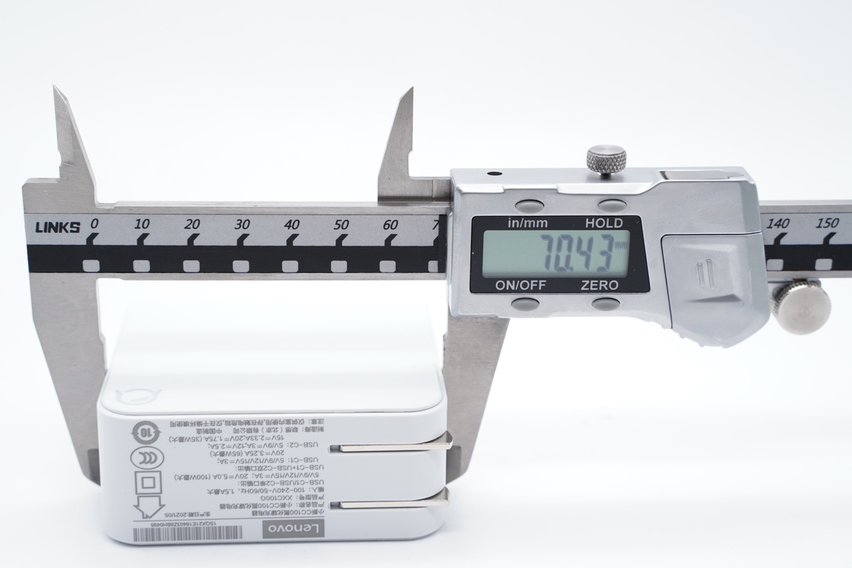 使用卡尺實測聯想小新CC 100氮化鎵充電器的長度約為70.43mm。