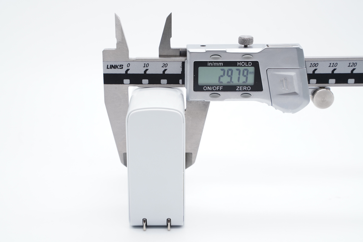 由此可以得出充電器的三圍參數為70.43x69.39x29.79mm,體積約為145.58cm3,以最高輸出100W計算,功率密度約為0.68W/cm3。