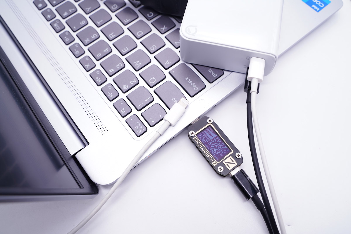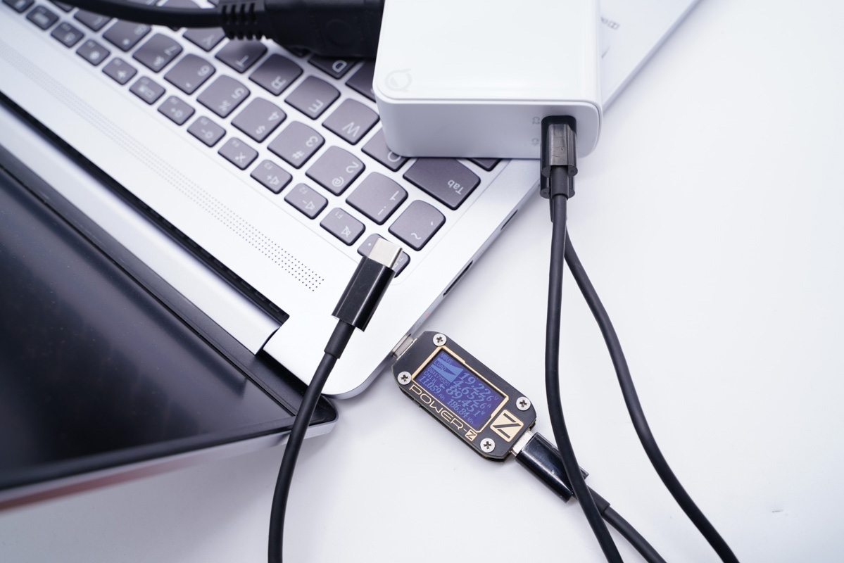經常看到有讀者反饋多口充電器的接口連著線,其中一個在工作另一個在閑置(空載),最終在工作接口的功率是否有影響,這里使用了C to C快充線進行了實測,無任何影響,USB-C接口為筆記本充電功率可以到達充電器的最大輸出。