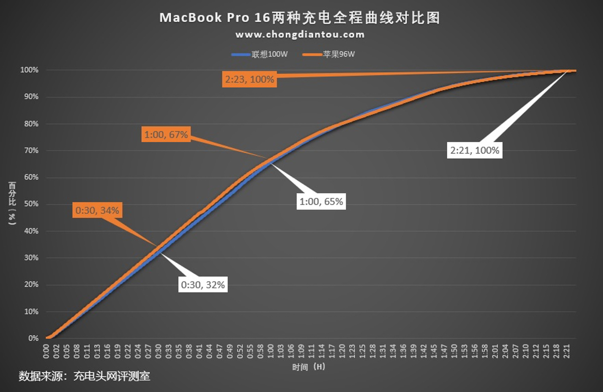這是使用聯想小新CC 100W氮化鎵充電器和蘋果96W PD充電器為MacBook Pro 16充電全程的曲線圖,蘋果96W PD充電器為MacBook Pro 16的原裝充電器。可以看出兩條曲線幾乎重合,使用聯想小新CC 100W氮化鎵充電器為MacBook Pro 16充電可以獲得和原裝一樣的快充體驗。
