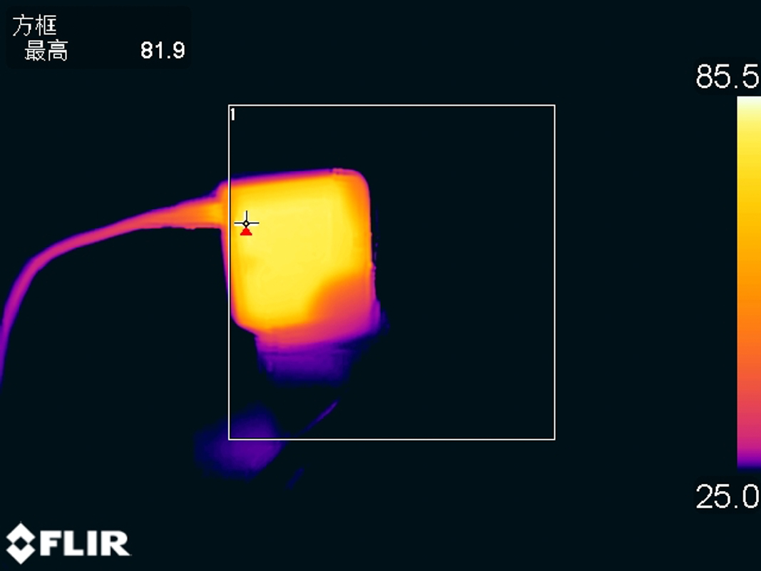 讓充電器以20V5A 100W的功率持續滿載輸出1小時后采集到充電器表面的最高溫度為81.9℃。