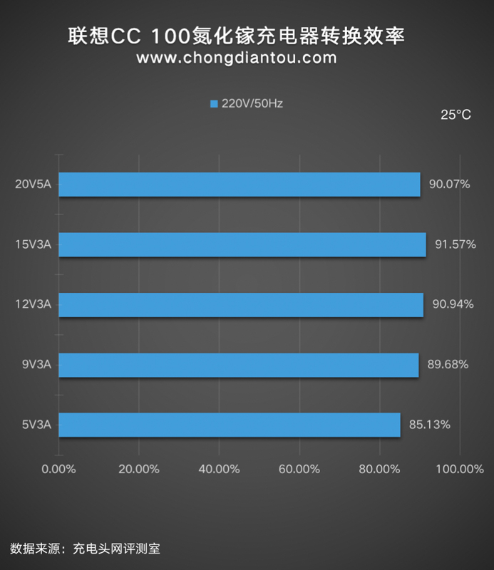 我們平時看充電器上面的參數輸出100W或者65W是充電器可以為設備提供的最大輸出功率,但充電器從插座上汲取的功率往往要更大一些,下面是聯想CC 100氮化鎵充電器在220V 50Hz和110V 60Hz交流輸入的情況下分別進行了轉換效率測試,測試結果如下:
