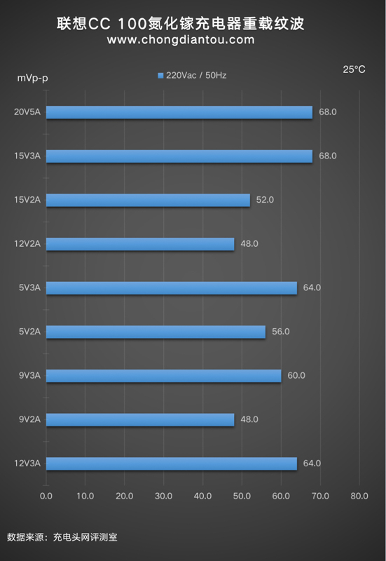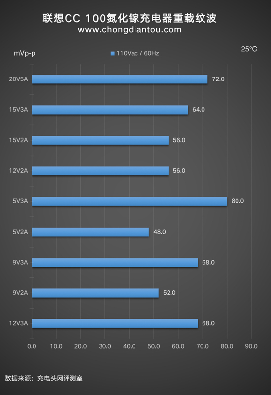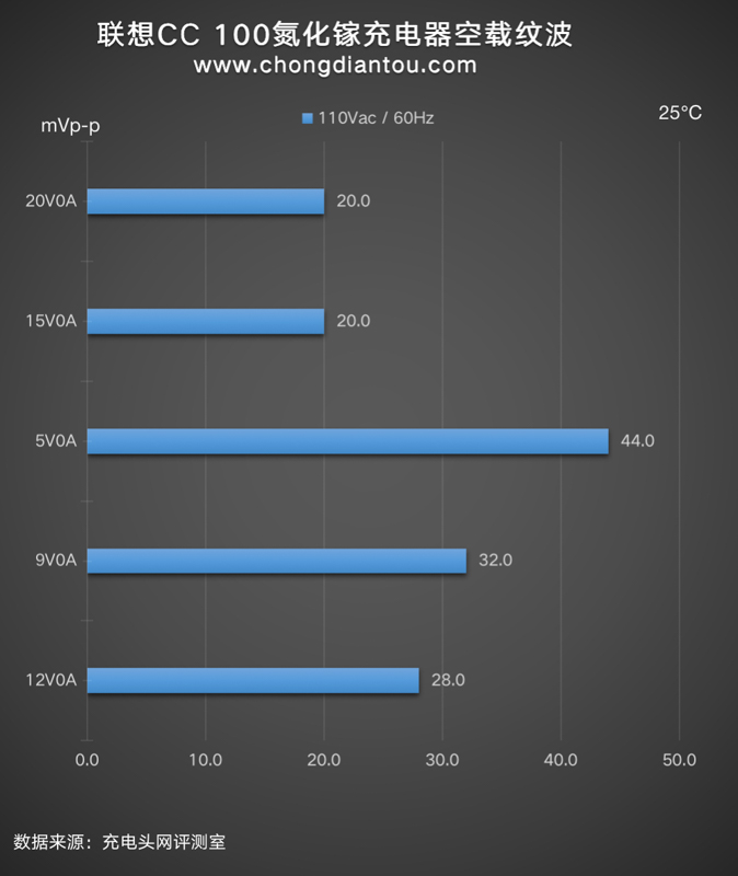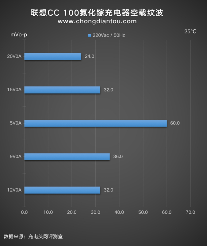 國家標準中充電器紋波要求是不高于200mVp-p,聯想CC 100氮化鎵充電器在110V 60Hz、220V 50Hz輸入電壓下,所有輸出功率紋波峰峰值均低于200mVp-p這個標準,表現不錯。