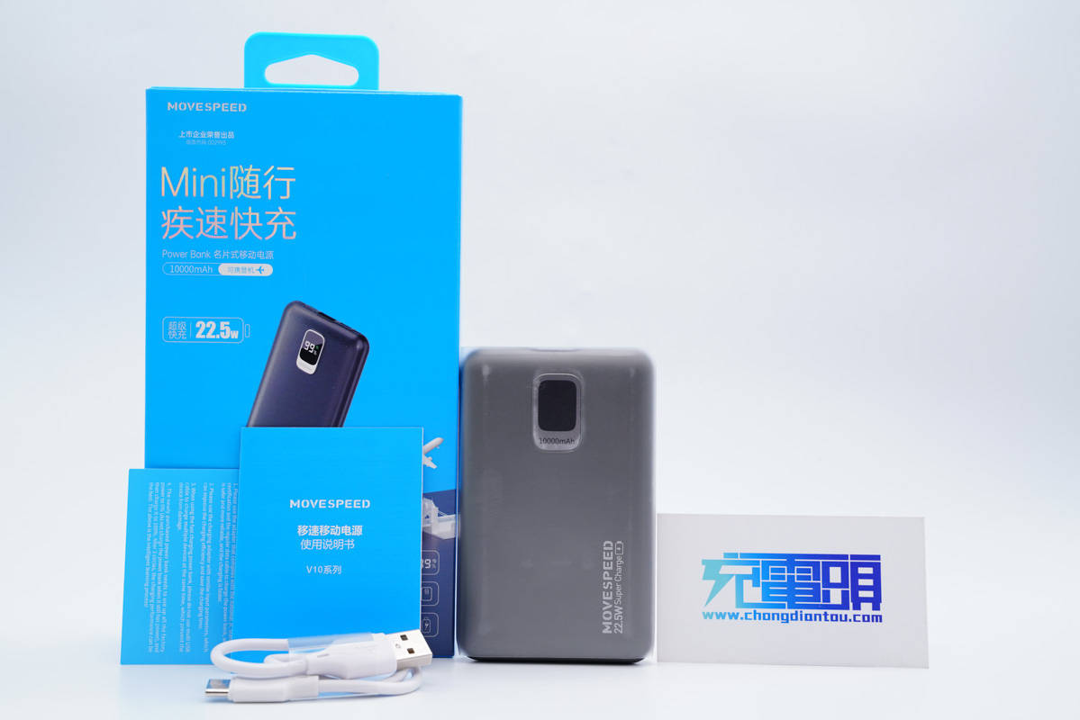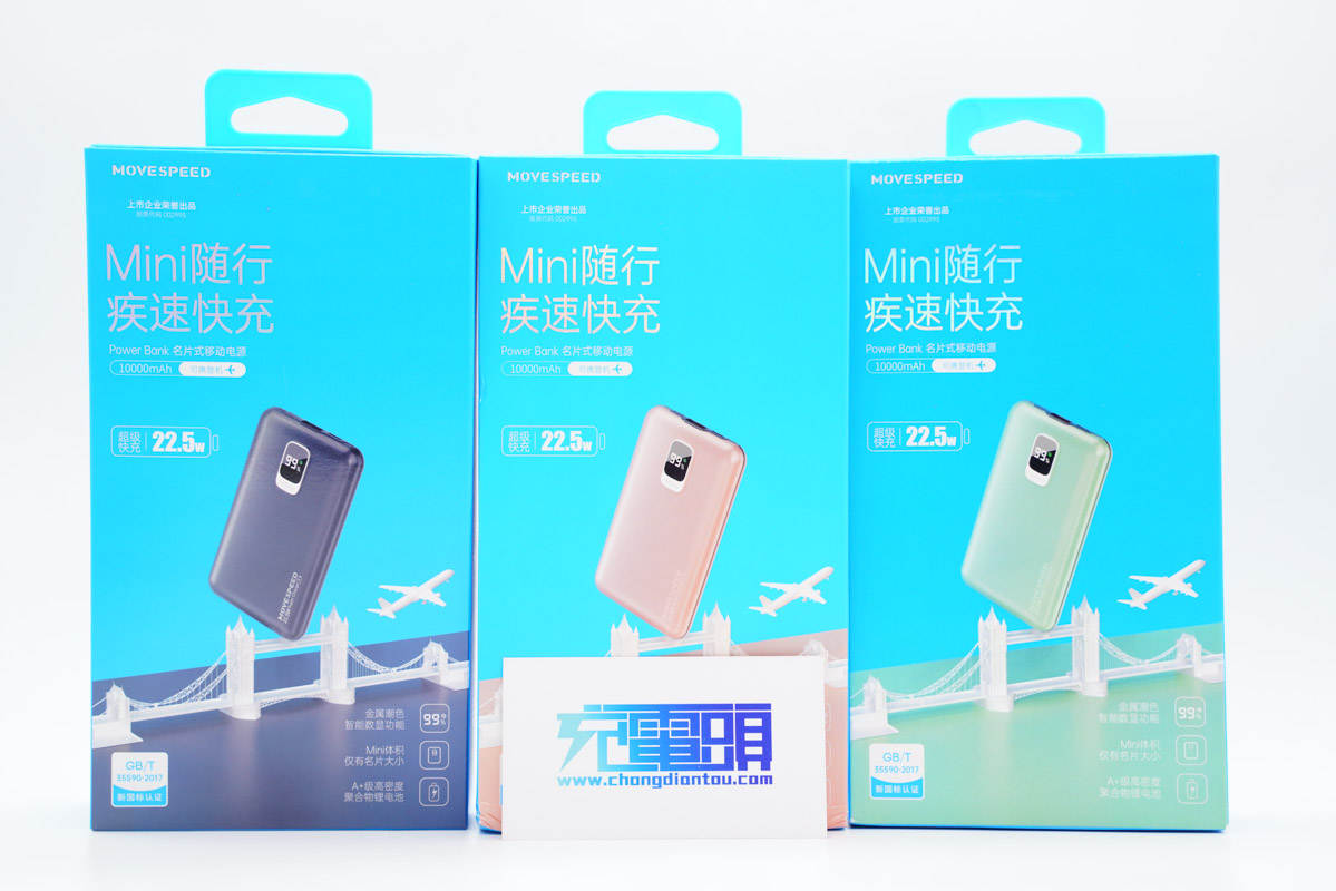 包裝盒正面印有MOVE SPEED品牌、產品名稱和外觀圖,此外還有22.5W快充、可上飛機等賣點標識。