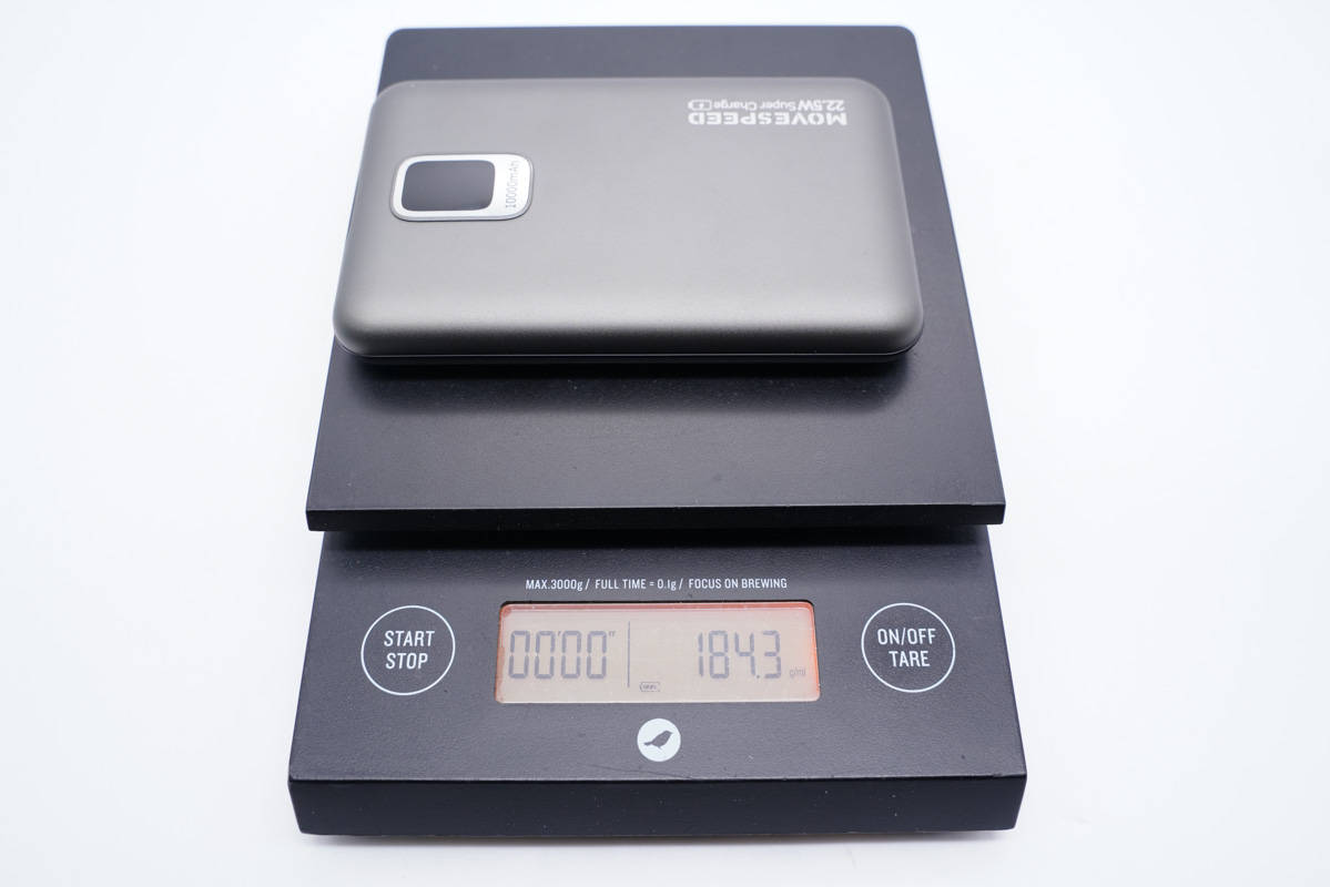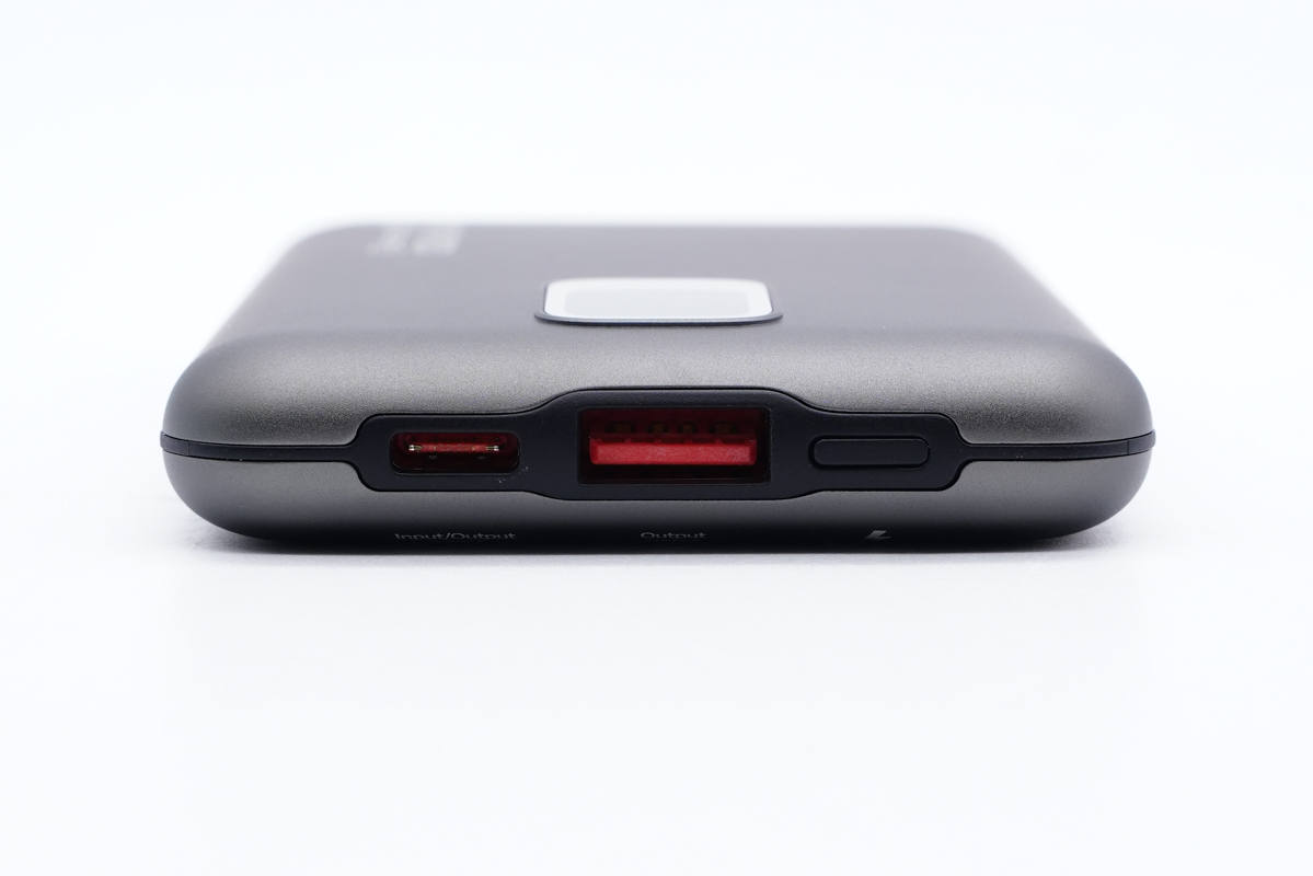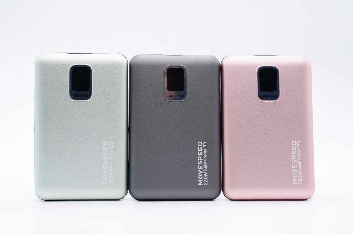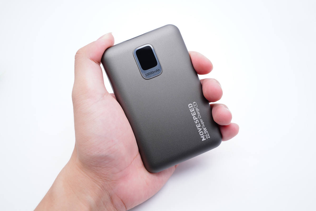 移動電源采用鋁合金材質外殼,表面噴砂邊角圓潤,整體小巧使用手感也很好。機身正面設有電量顯示屏,右下角印有MOVE SPEED品牌和22.5W Super Charger。