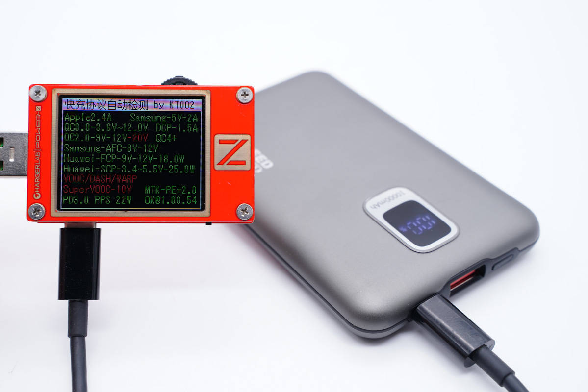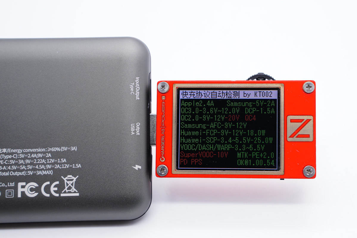 使用KT002測得USB-C口支持QC2.0/3.0、AFC、FCP、SCP、PE2.0、PD3.0和PPS快充協議。