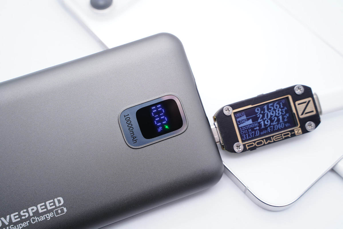使用移速這款移動電源給iPhone 12 Pro Max充電,使用ChargerLAB Power-Z KM001C測得充電功率為9.16V 2.1A 19.21W,綠色閃電指示燈表示正在進行PD快充。