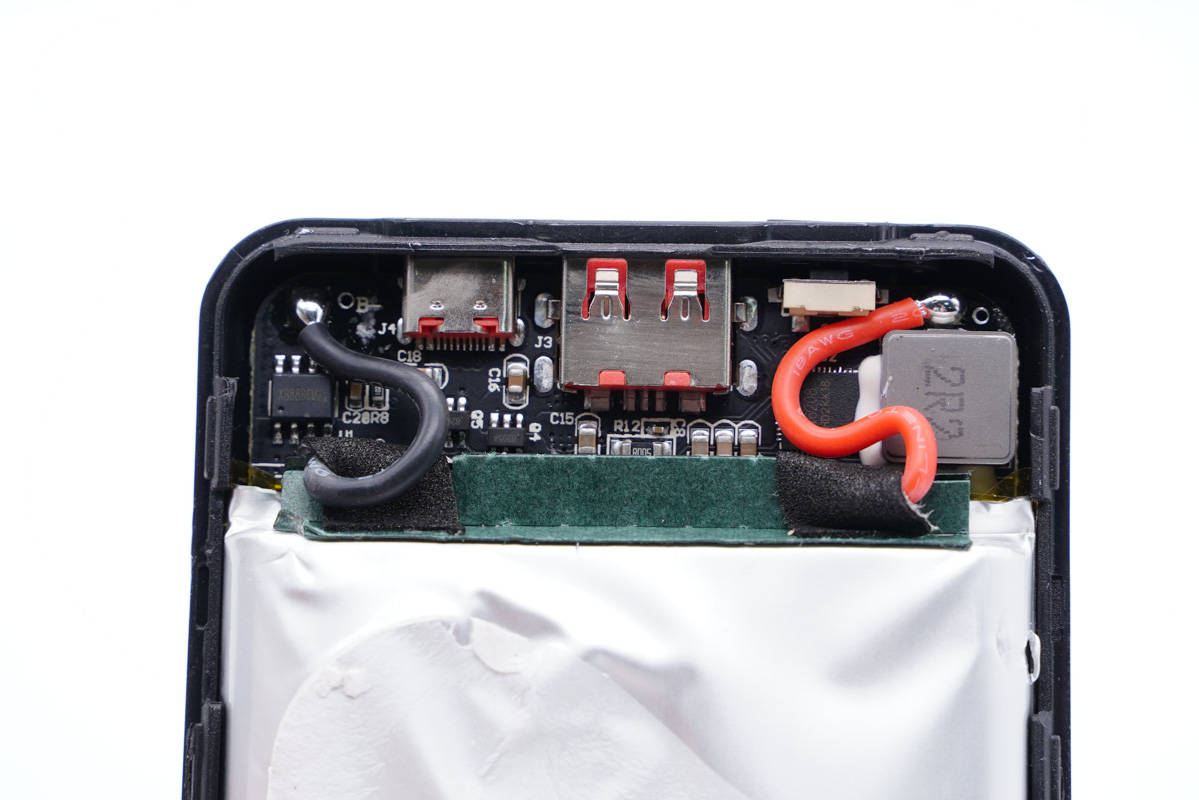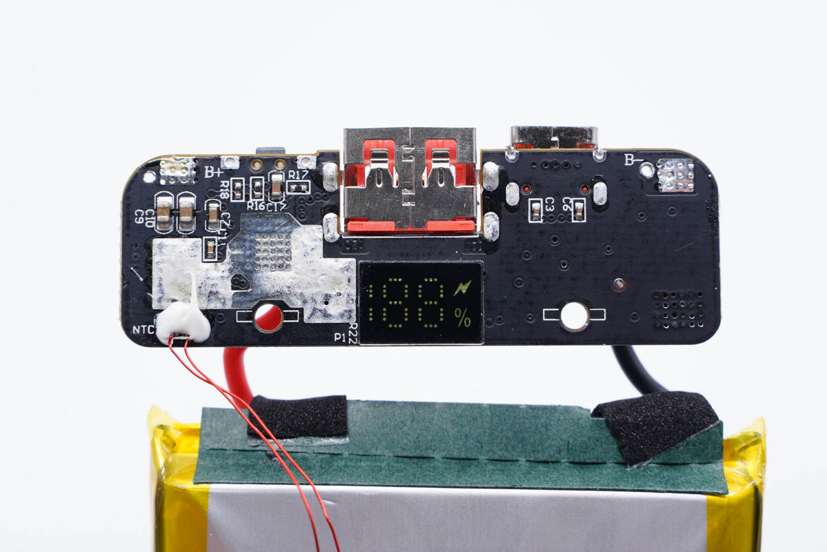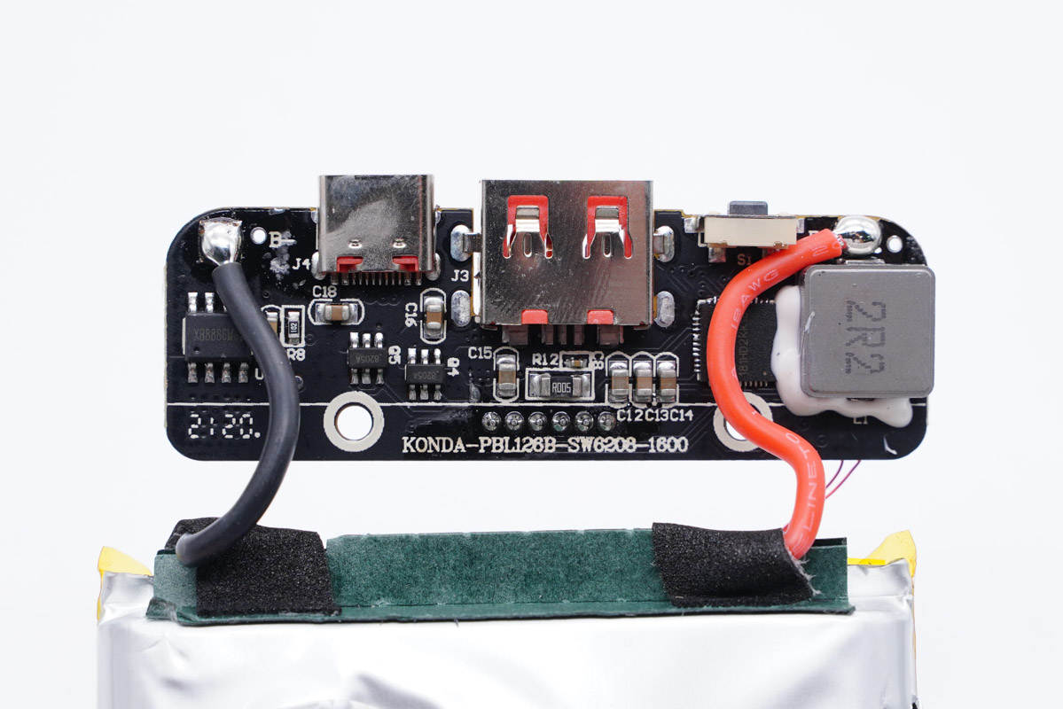 充電頭網通過拆解發現,移動電源電芯來自格林德,采用高壓電芯,這款電芯也是該產品做到如此小巧的關鍵。電芯前后端貼有青稞絕緣紙保護,此外打膠加固,并配有熱敏電阻進行溫度監控,賽芯微XB8886M進行電路保護。移動電源主控芯片采用智融SW6208高集成雙向快充解決方案,雙口輸入輸出協議識別電壓控制以及LED屏電量顯示等功能均由其實現,性能強悍,質量可靠。