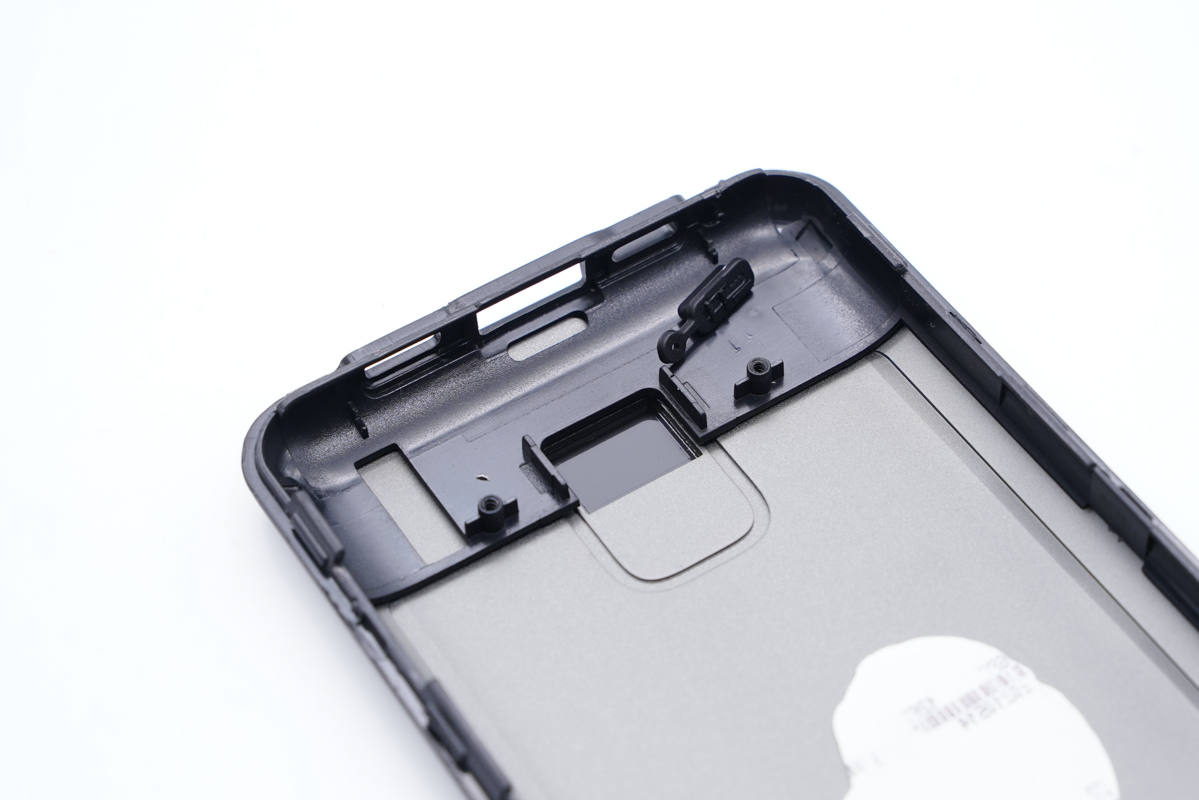 將機身殼拆開,兩半金屬殼通過邊緣塑料殼卡扣封裝固定,電芯打膠固定。
