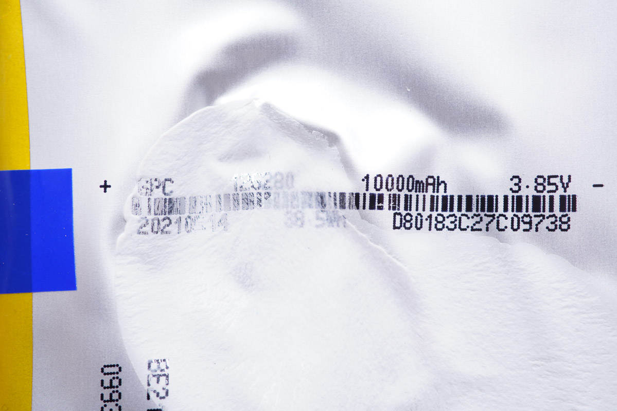 電芯來自GPC格林德,規格為10000mAh/3.85V/38.5Wh,2021年4月14日生產,規格為長80mm,寬62mm,厚12mm;電芯品牌為業界中高端定位常見的格林德。