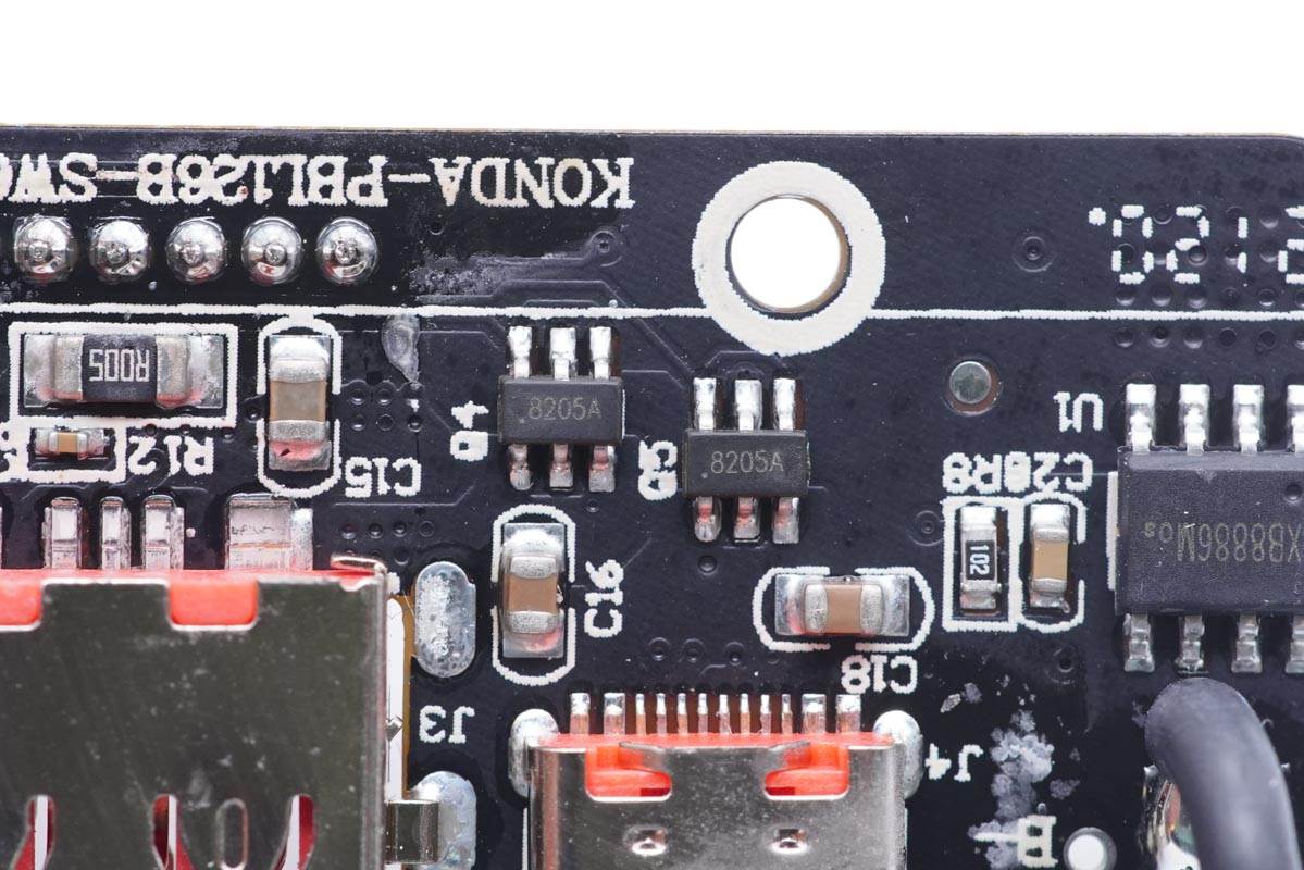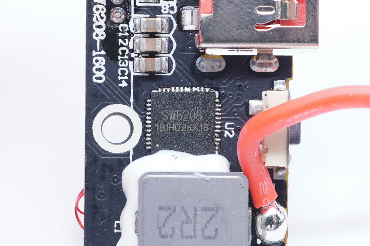 移動電源主控芯片采用智融SW6208。這是一款高集成度的多協議雙向快充移動電源專用多合一芯片,支持 A+A+B+C+L口任意口快充。其集成了5A高效率開關充電,22.5W高效同步升壓輸出,支持PPS、PD、QC、AFC、FCP、SCP、PE、SFCP等多種快充協議,電量計量,數碼管/LED燈顯示以及相應的控制管理邏輯。外圍只需少量的器件,即可組成完整的高性能雙向快充移動電源解決方案。