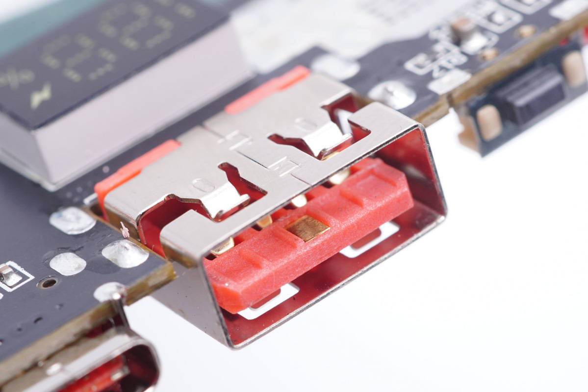 USB-A母座特寫,沉板過孔焊接,前端具有特殊觸點且正負極加寬。