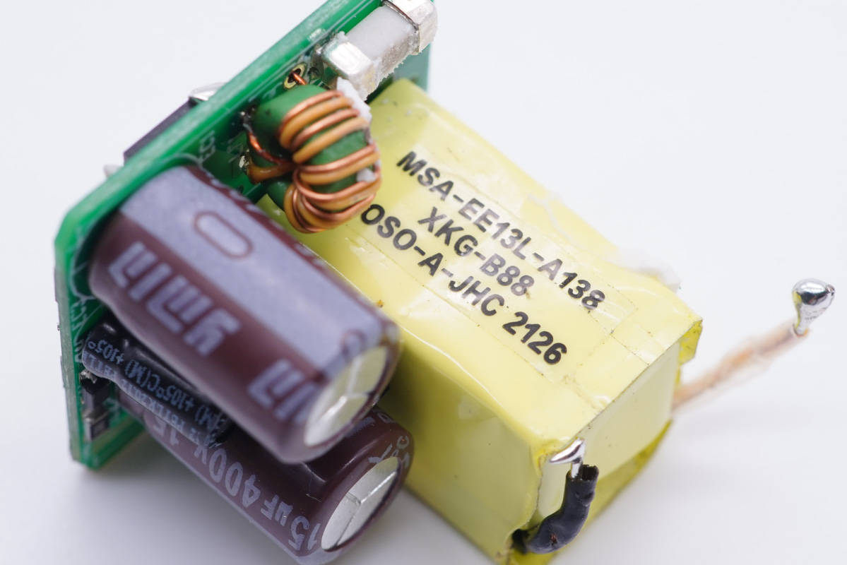 兩顆高壓濾波電解電容采用永銘KCX系列產品,規格均為400V 15μF。該系列產品工作溫度范圍在-55℃~105℃,3000小時壽命,并具備抗雷擊、低漏電流(低待機功耗)、高紋波電流、高頻低阻抗等性能優勢。