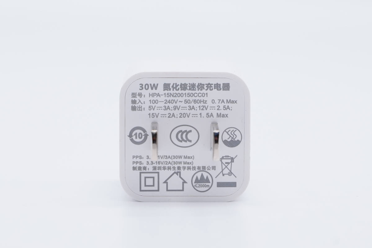 華科生這款迷你30W氮化鎵快充采用PC材質白色外殼,表面啞光,頂面微凸。充電器腰身以及頂面均空白,方便客戶進行差異化定制。