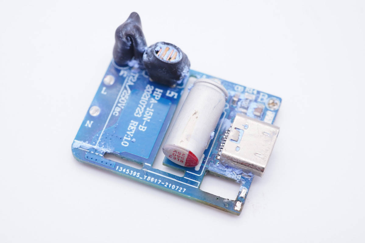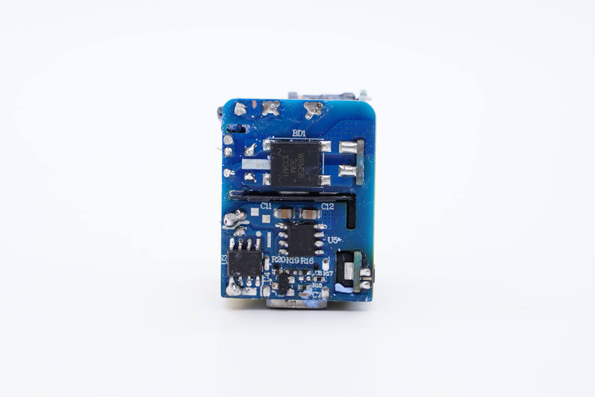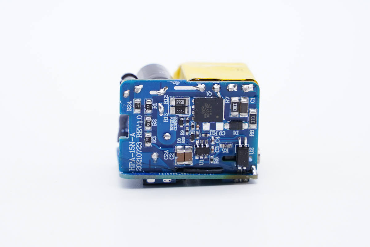 小板背面設有開關電源主控芯片、氮化鎵功率芯片和光耦。