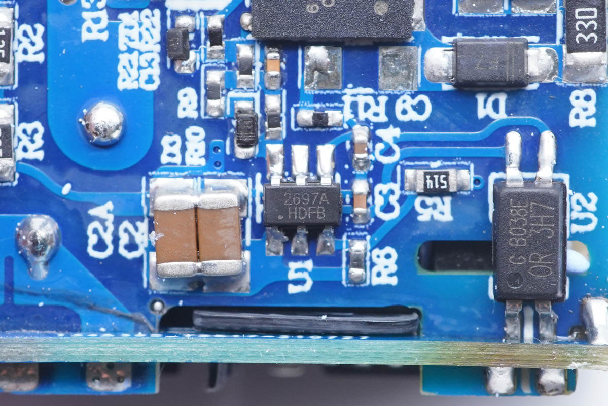 開關電源主控芯片采用茂睿芯MK2697A,這是專為PD/快充應用優化的QR ?PWM控制器。其很寬的VCC工作電壓范圍(9V-90V)可以使其覆蓋PD/PPS從3.3V-23V的輸出范圍而不需要使用額外的繞組或者線性降壓電路。