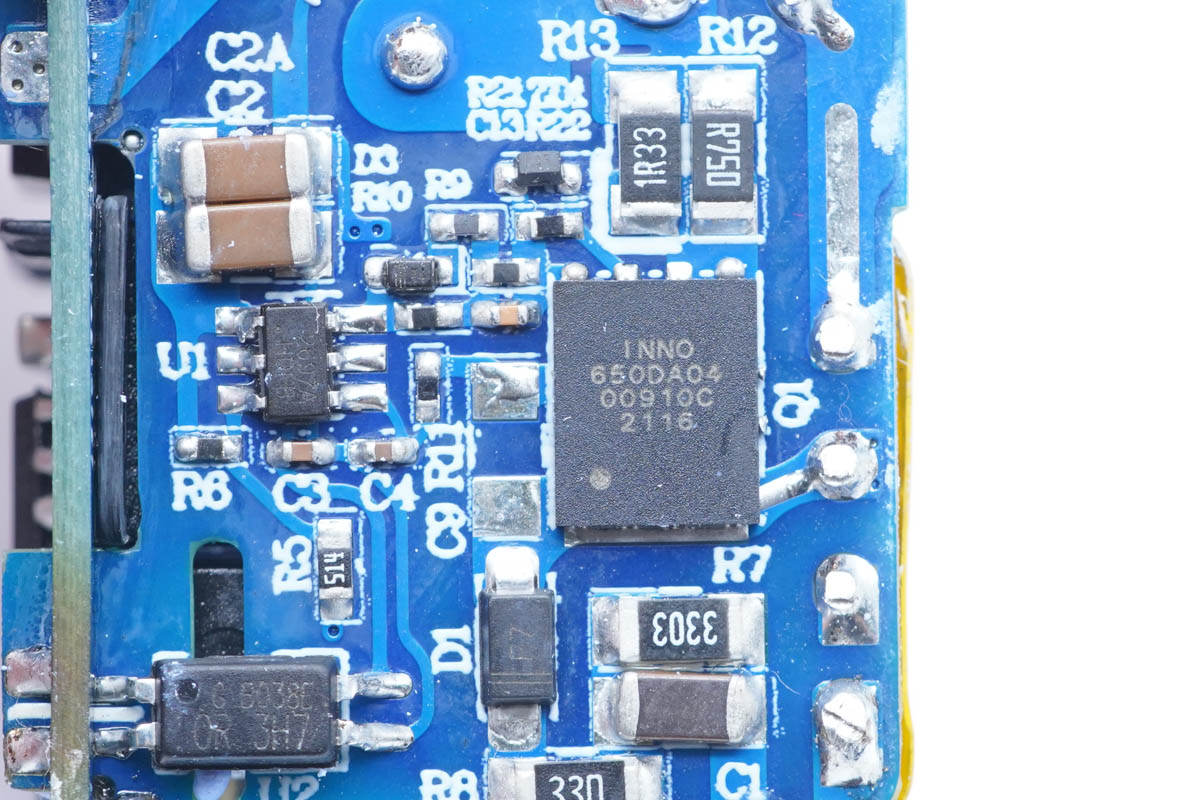 氮化鎵功率芯片采用英諾賽科INN650DA04,耐壓650V,導阻480mΩ(max),具備高頻高效、極低損耗、快速主動散熱等特點,同時采用DFN5*6封裝,實現小體積、高效率的充電器設計。