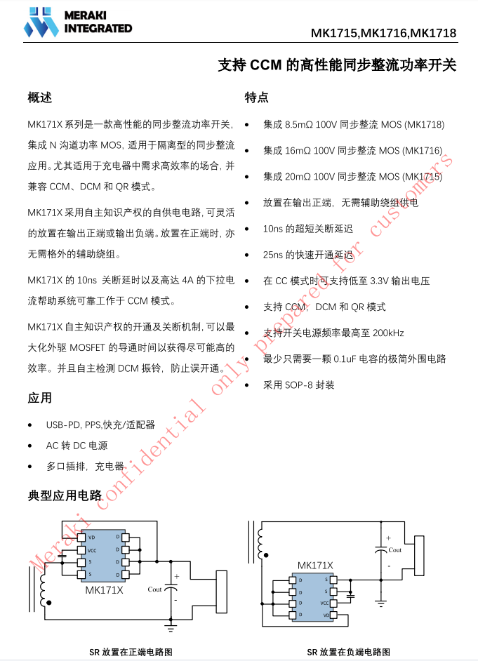 同步整流芯片采用茂睿芯MK1718,集成了次級同步整流控制器和8.5mΩ/100V規格同步整流MOS。茂睿芯MK171X系列是一款高性能的同步整流功率開關,集成N溝道功率MOS,適用于隔離型的同步整流應用。尤其適用于充電器中需求高效率的場合,并兼容CCM、DCM 和QR模式。