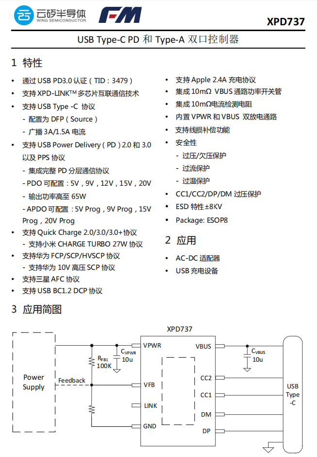USB PD協議芯片采用云矽半導體XPD737,這款芯片已經通過了USB PD3.0認證,TID:3479。支持QC2.0/3.0/3.0+、AFC、FCP、SCP、HVSCP、PD和PPS等主流快充協議外,還支持小米CHARGE TURBO 27W協議,華為10V高壓SCP協議。XPD737內部集成 10mΩ VBUS 通路管,并且集成10mΩ電流檢測電阻,支持完善的保護功能,降低外圍元件數量,簡化電路,降低成本。采用ESOP8封裝。