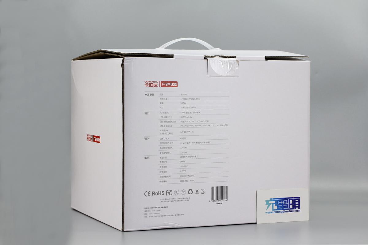 包裝盒為白色配色,整體看去顯得比較簡潔。盒子正面印有卡旺達品牌、名稱型號、小體積大容量賣點以及產品外觀圖。包裝盒頂部有提手方便搬運。