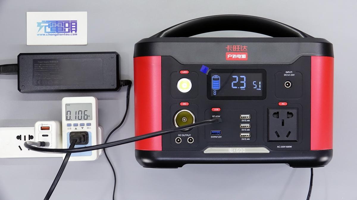 使用附帶的90W適配器給戶外電源充電,測得輸入功率為97.62W,從零開始充電全程需求6個多小時。屏幕上實時顯示電量、時間、各功能開啟情況等。