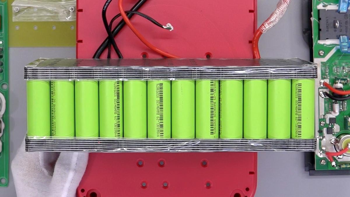 一共有5排電池,也就是電池組由60顆18650電池組成。右側兩顆電池間固定有一顆熱敏電阻,用于溫度監控。
