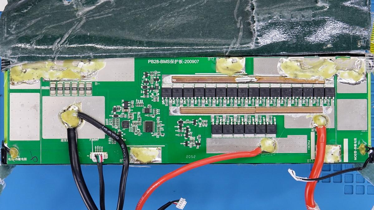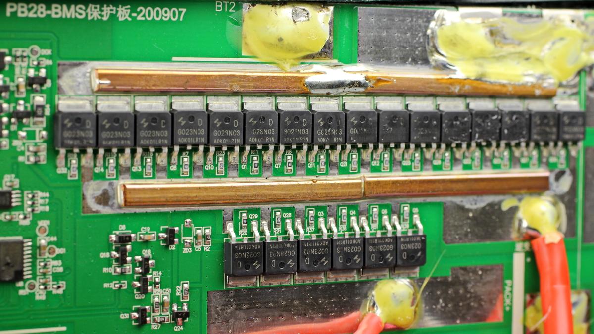 撕掉可以看到下面是電池組保護電路板,板子多處露銅加錫處理,增強散熱,MOS管處焊接銅帶均流。