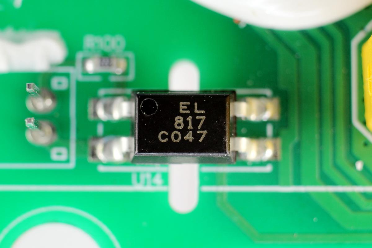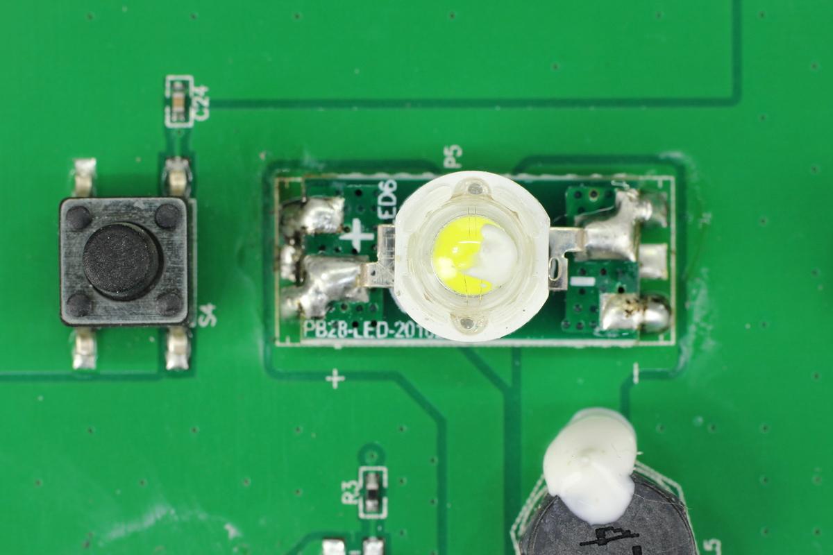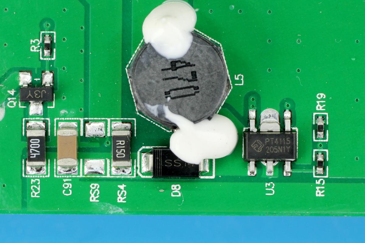 華潤矽威 PT4115 高亮LED驅動芯片,最高輸出電流1.2A,開關降壓模式驅動。旁邊的470降壓電感打膠固定。