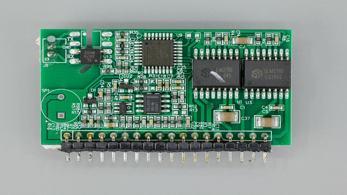 功能模塊正面一覽,正面有一塊屏幕和多顆MOS管。