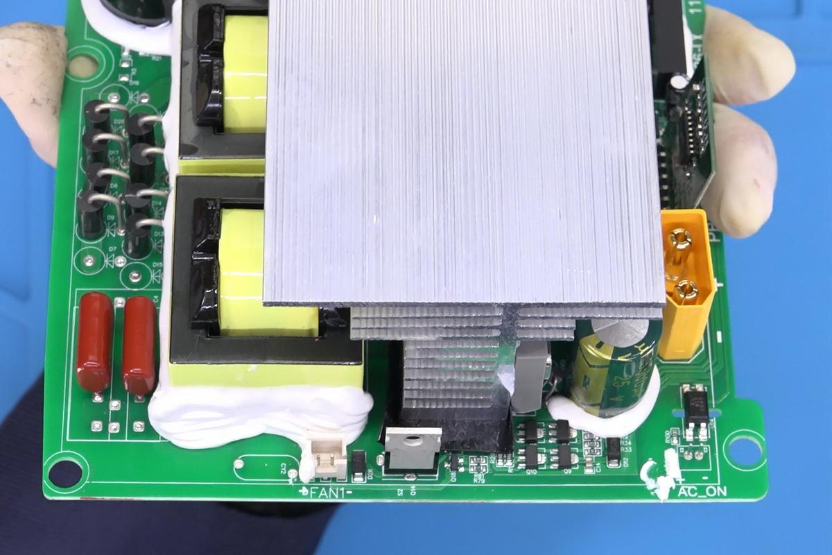 充電頭網通過拆解發現,這款戶外電源內置兩個散熱風扇,可以給內部進行主動散熱,保證大功率輸出發熱問題。此外拆解發現戶外電源采用60顆18650汽車級動力電芯,從加固、絕緣、溫控、均流等各方面對電池組進行保護。
