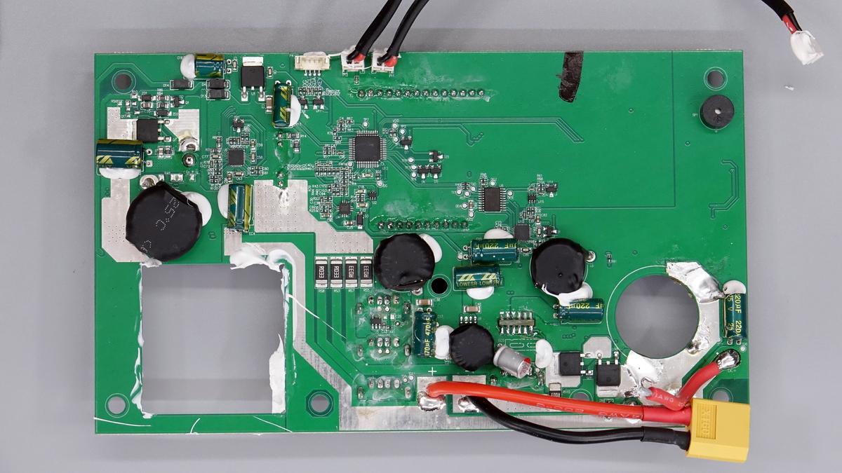 布局上,最上端是逆變升壓模塊,下方是電池組,前端固定有功能模塊電路板,三者間通過導線插拔式連接。