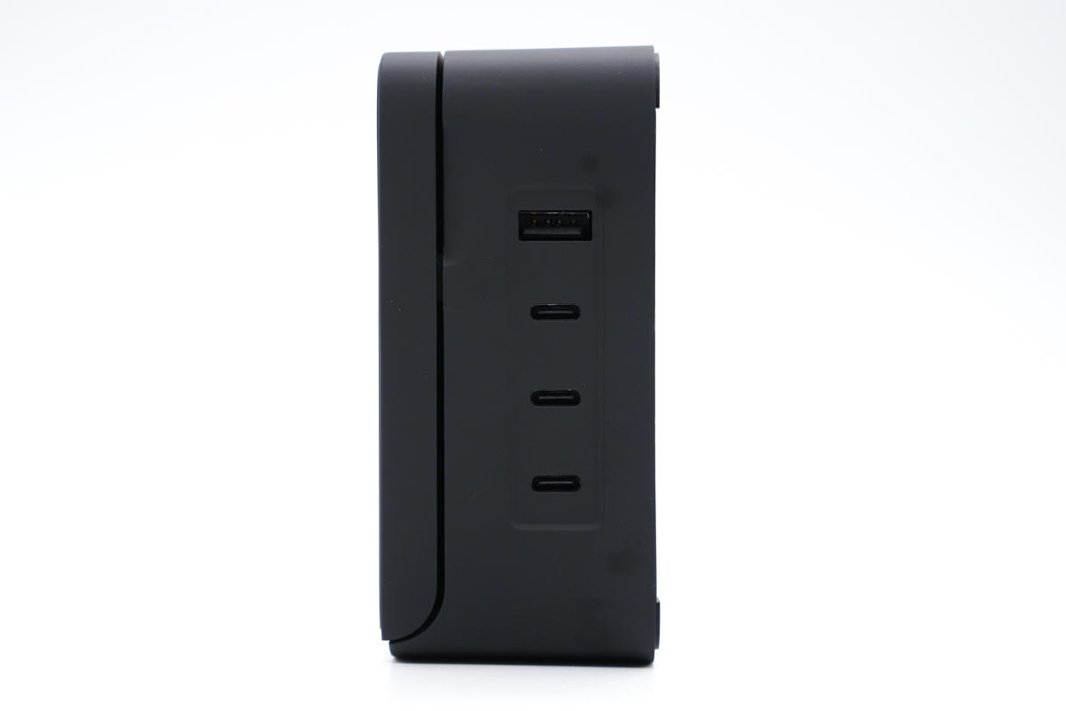 充電器底座一側(cè)設(shè)有3C1A四個(gè)USB接口,均采用黑色膠芯,渾然一體。