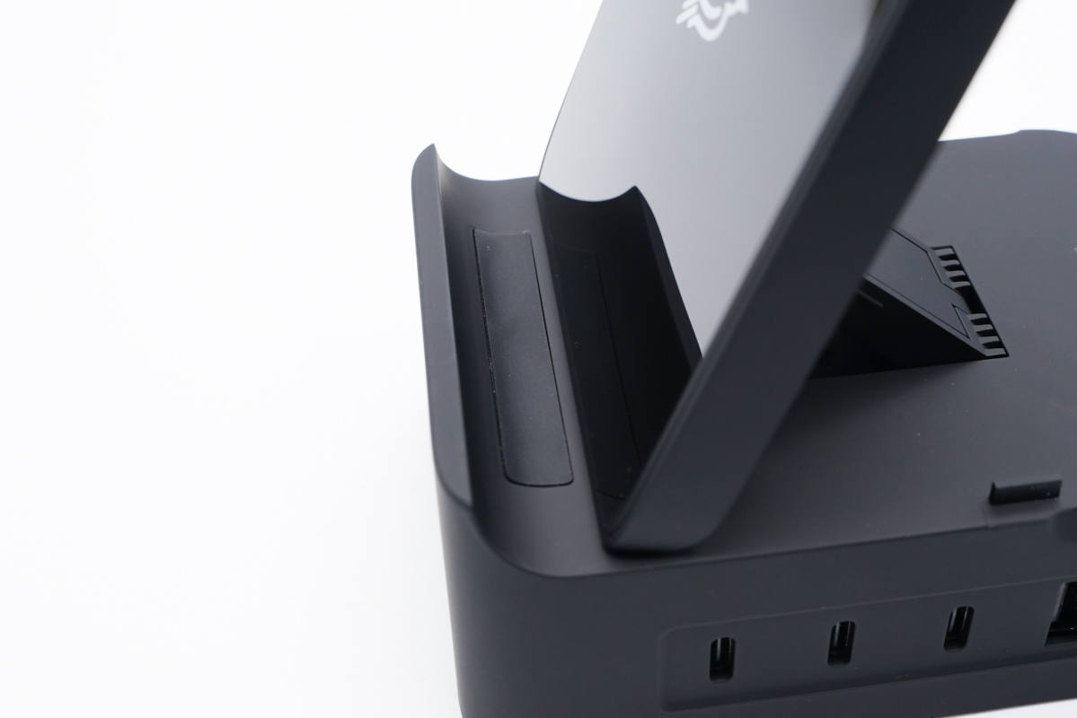 將無(wú)線充電板取出即可搖身一變成為立式無(wú)線充底座,而且是不僅僅支持無(wú)線充,底座USB口還能給設(shè)備進(jìn)行最大100W快充,最多可同時(shí)給五臺(tái)設(shè)備充電,簡(jiǎn)直是桌面充電神器。