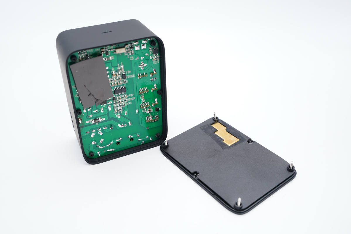 拆掉底部外殼,PCB板左上角貼有導(dǎo)熱墊。