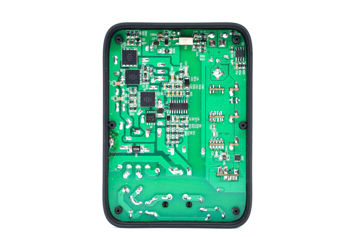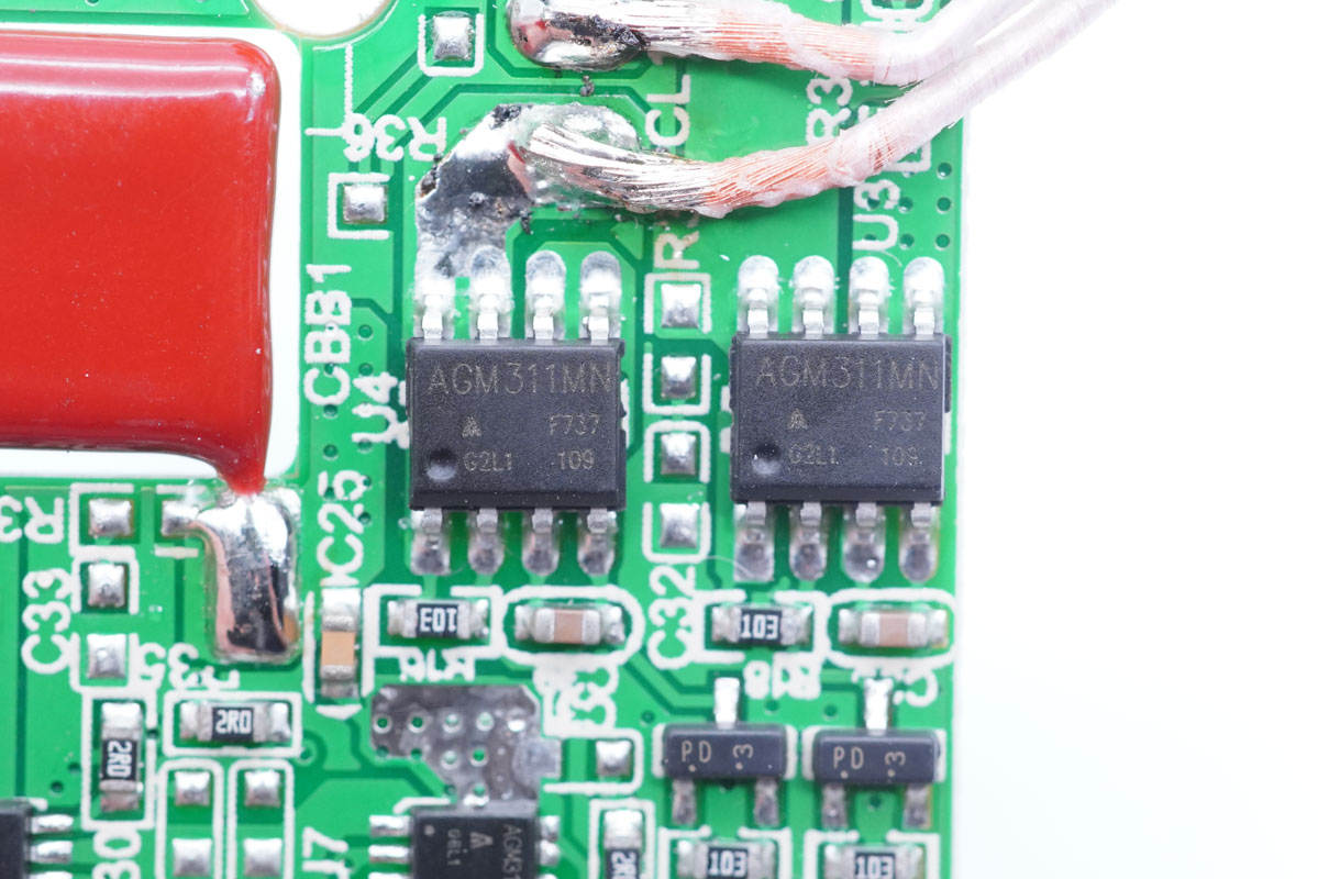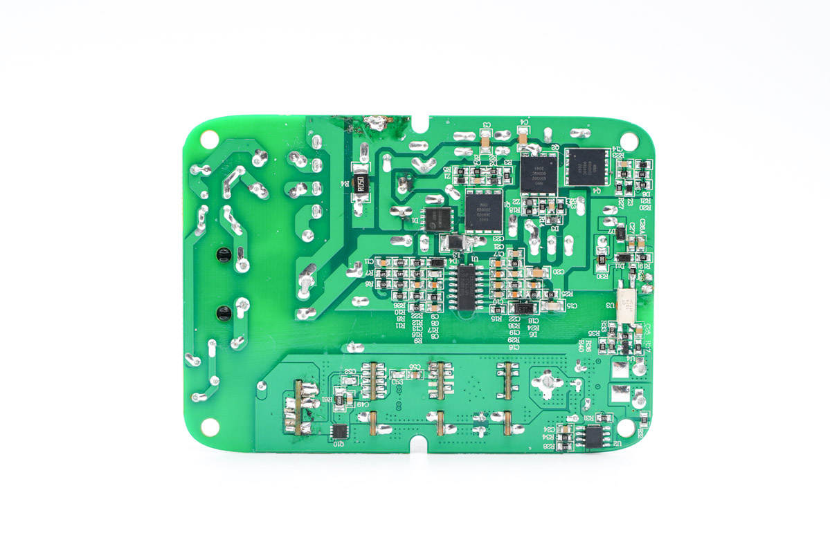 PCB板背面一覽,初次級(jí)分界明顯,最顯眼的莫過(guò)于右上角的三顆氮化鎵開(kāi)關(guān)管。