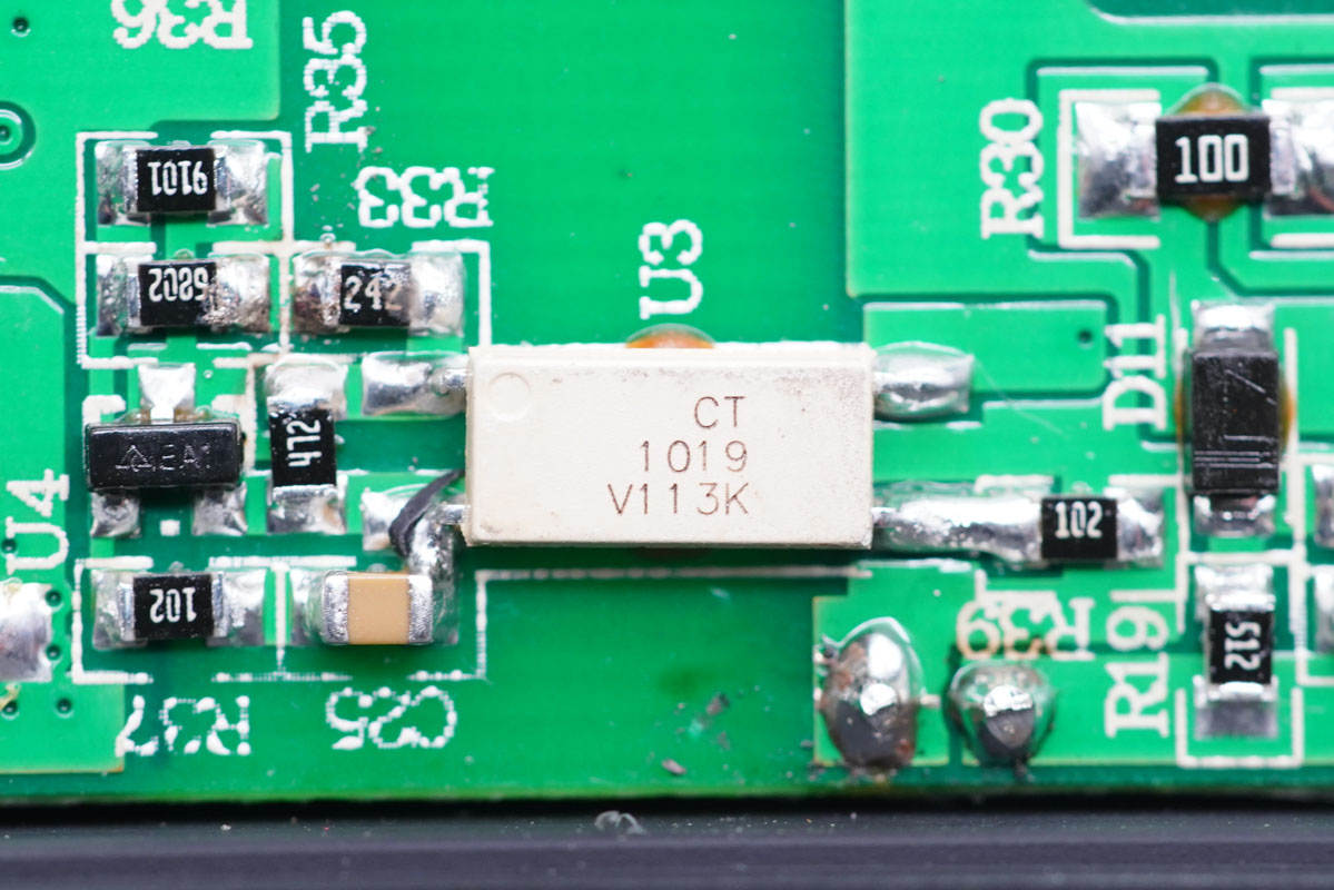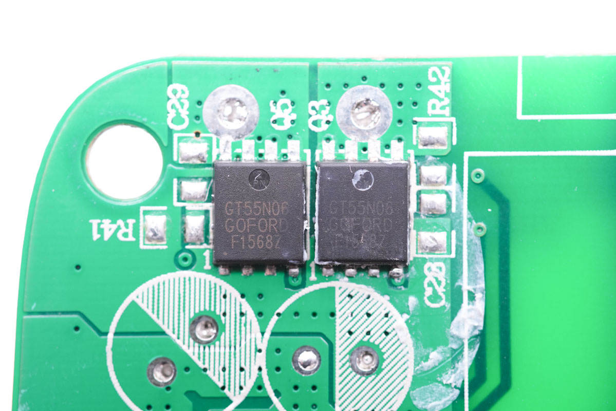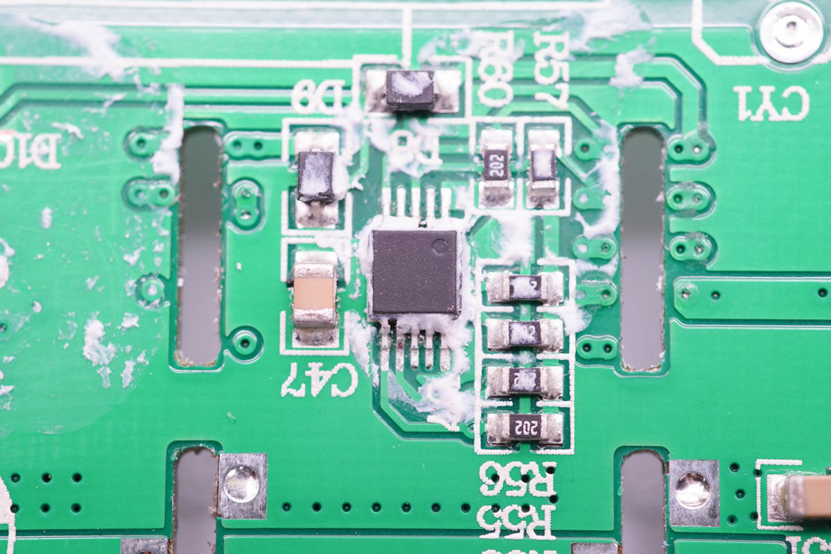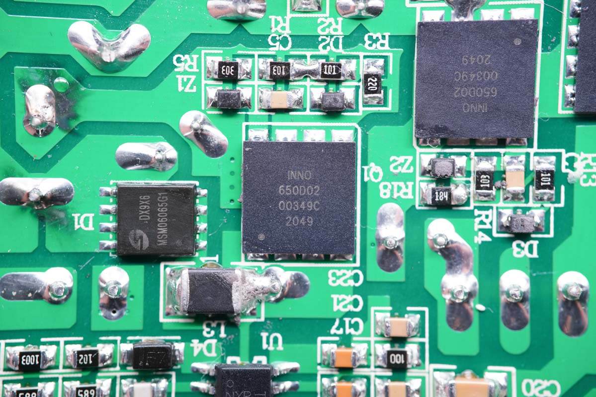 PCB板背面一覽,初次級(jí)分界明顯,最顯眼的莫過(guò)于右上角的三顆氮化鎵開(kāi)關(guān)管。