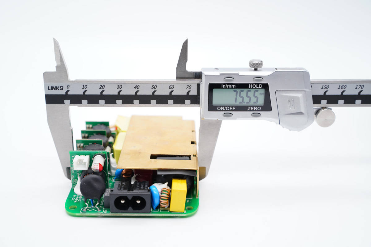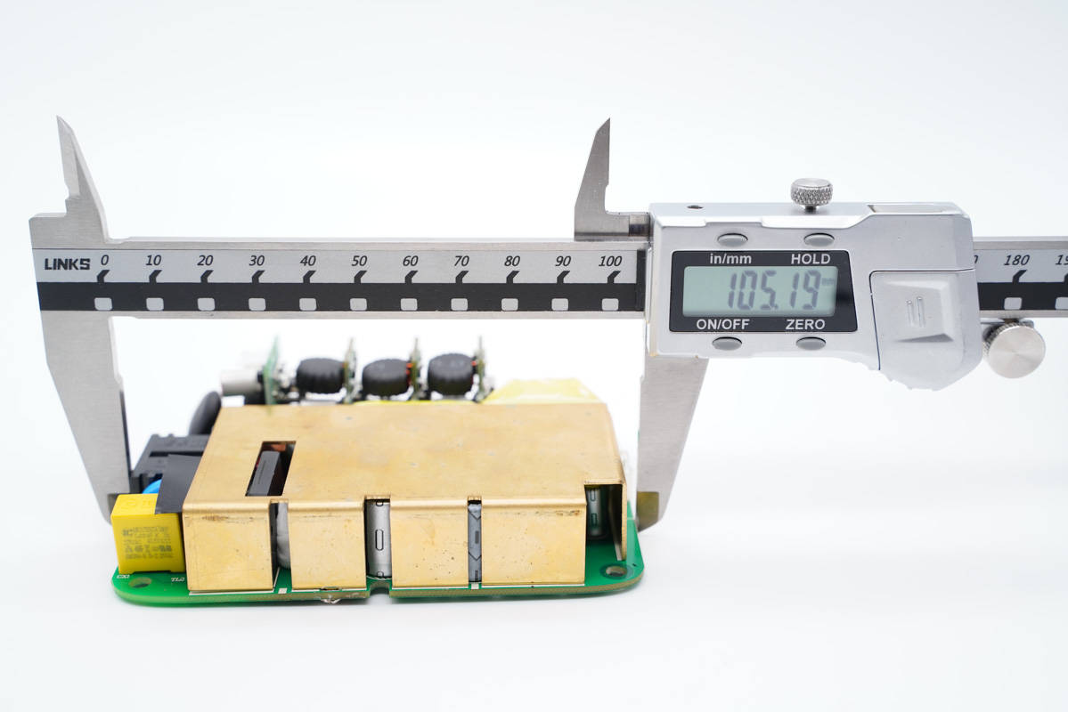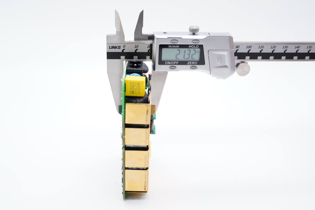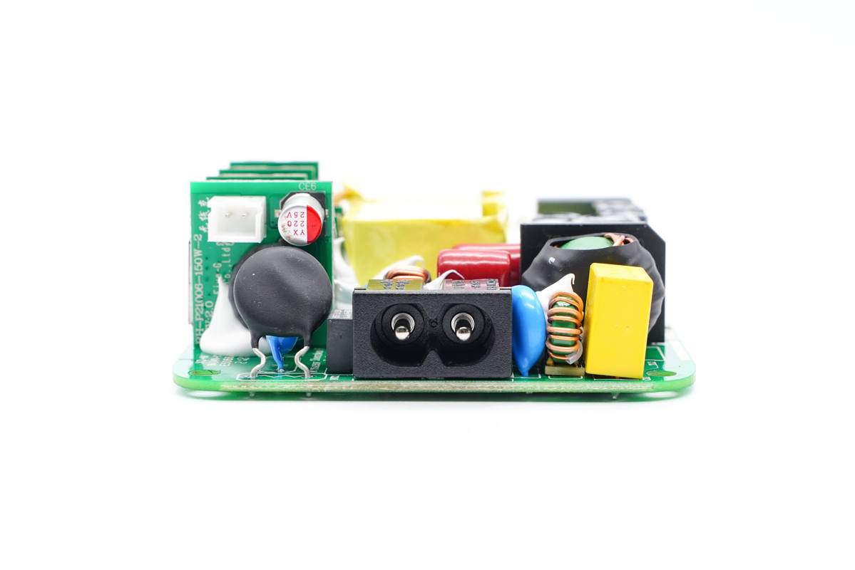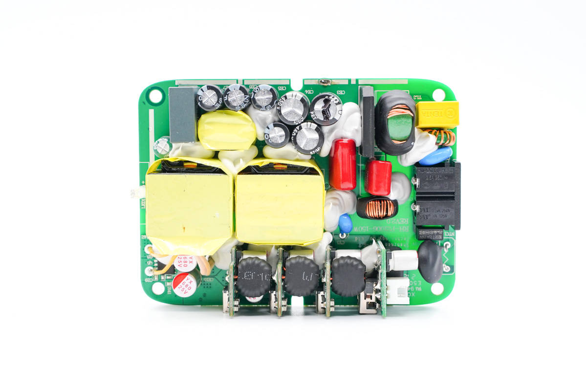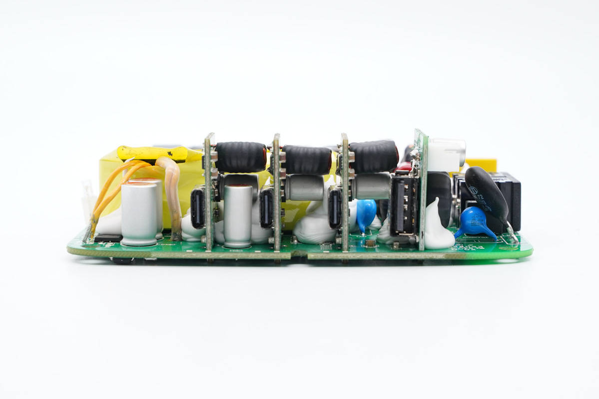 PCB板正面一覽,電容、電感、變壓器等器件統(tǒng)統(tǒng)打膠加固,高壓側(cè)設(shè)有多達(dá)7顆高壓濾波電解電容,輸出端USB母座則均焊接在小板上,左側(cè)中間是PFC升壓電感和變壓器。