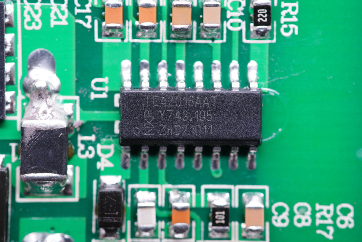 充電器主控芯片采用NXP恩智浦TEA2016AAT,內(nèi)置LLC控制器和PFC控制器,內(nèi)置數(shù)字架構(gòu)控制,簡(jiǎn)化了設(shè)計(jì)的同時(shí)減少外圍元件數(shù)量,芯片內(nèi)置多重完善的保護(hù)功能。