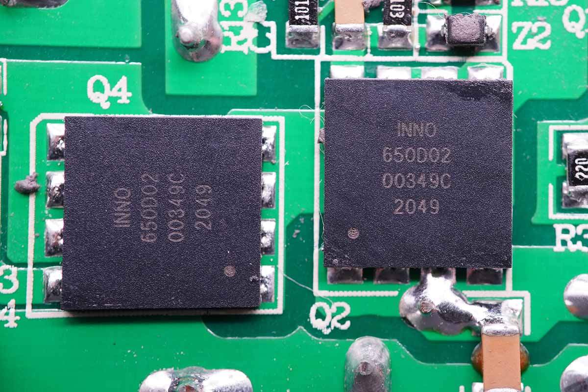 LLC開(kāi)關(guān)電源的兩顆高壓開(kāi)關(guān)MOS管也是采用的英諾賽科INN650D02氮化鎵功率芯片。