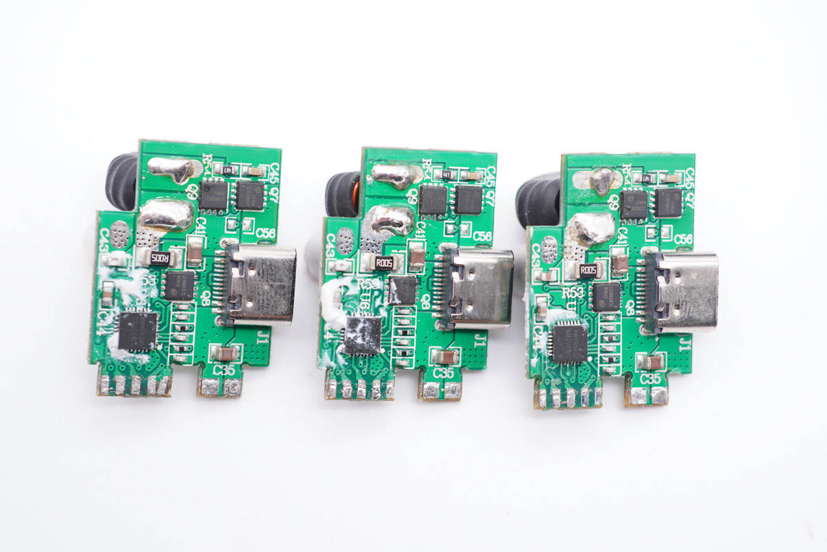 觀察發(fā)現(xiàn)三個(gè)C口母座所在小板上設(shè)有相同的DC-DC二次降壓輸出方案,而且從功率分配可以了解到C3口和A1口共用一路。小板正面均設(shè)有降壓協(xié)議芯片以及三顆MOS管。