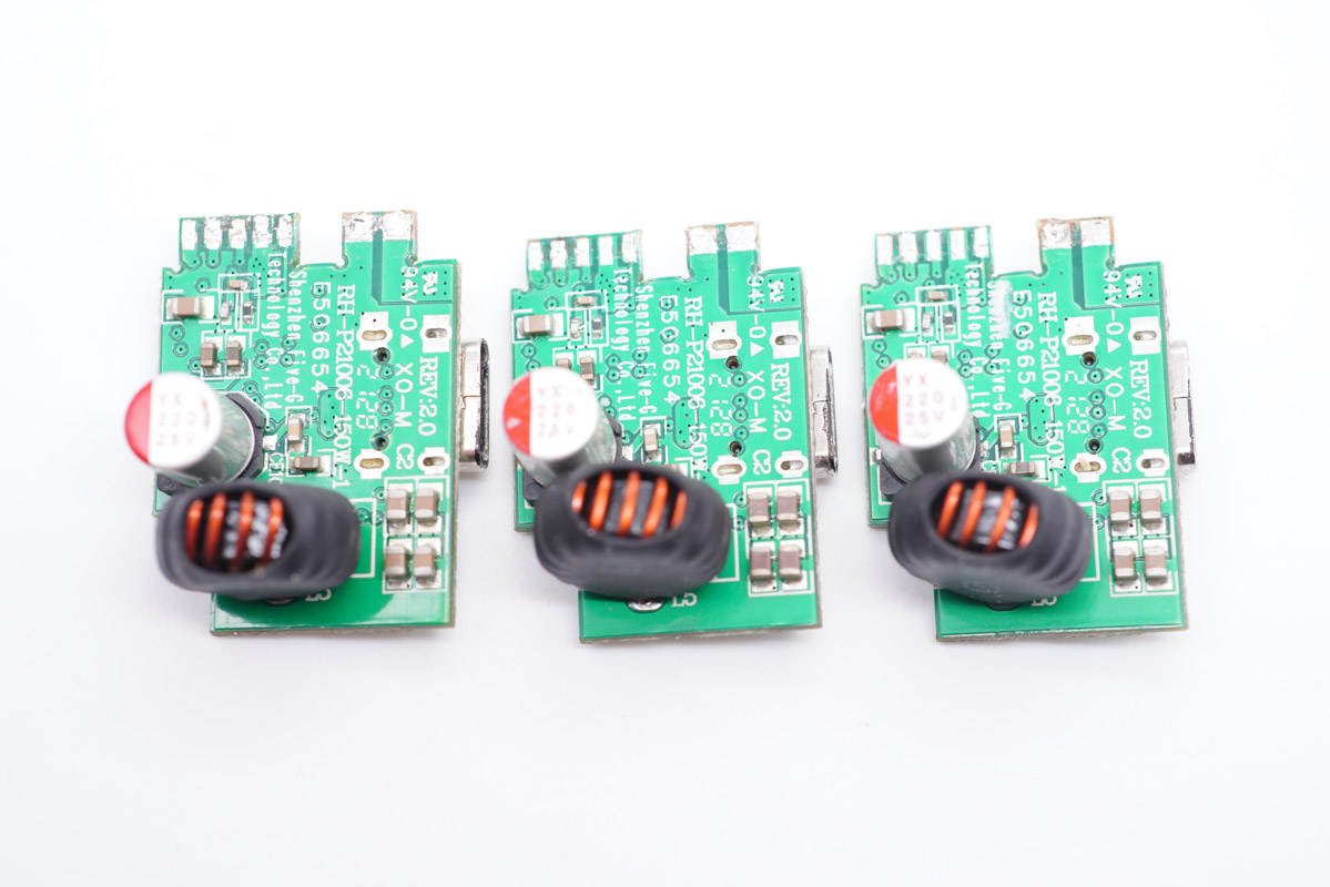 PCB板使用固定柱固定,導(dǎo)熱墊下是三顆氮化鎵功率芯片。