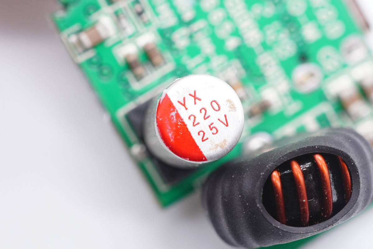 兩顆輸出濾波固態(tài)電容來(lái)自福建云星電子有限公司,規(guī)格為25V 680μF。“YX”牌固態(tài)電容專(zhuān)門(mén)針對(duì)USB PD快充設(shè)計(jì),在105℃的工作環(huán)境下仍能保證2000小時(shí)的壽命,同時(shí)兼具耐高溫、耐大紋波、低ESR等特性。