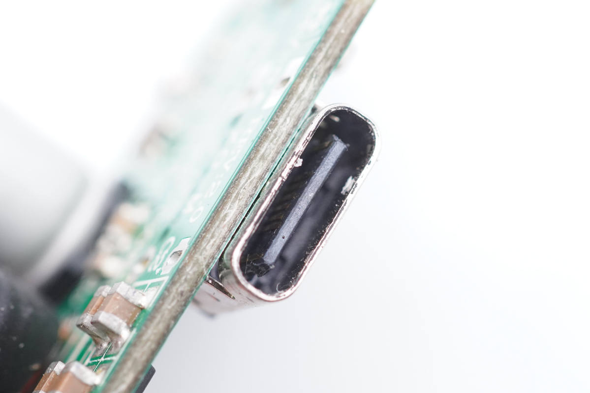 USB-C口母座特寫(xiě),過(guò)孔焊接。